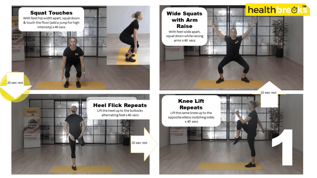 Health Breaks subscribers can tap into the 100s of exercise Pods to slot into your day. Try the canape ideas shown in our photos above and give this workout curcuit a go – perfect to adapt to a 5, 10 or 20min session.